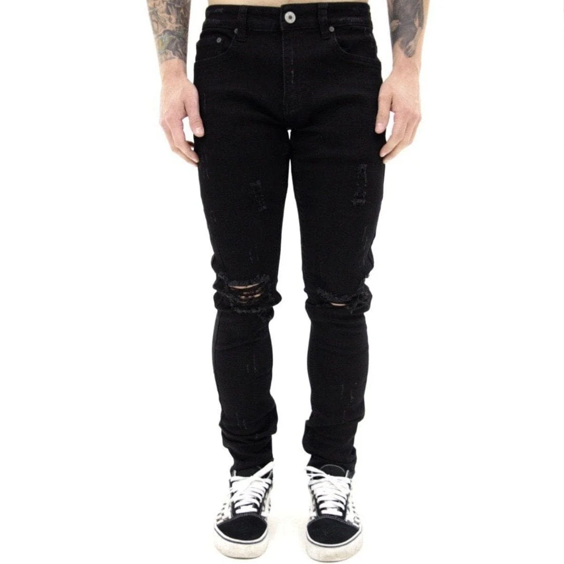 TheĀ "MIDNIGHT BLACK" jean feature a jet black wash with a skinny fit. 4-way stretch. Distressing throughout. [S4] skinny silhouette --- fitted from the waist straight down to the ankle. Five-pocket styling. Leather logo patch at back waistband. Zip-fly. 5 1/2" W leg opening. SERENEDE branded buttons and rivet hardware accent
